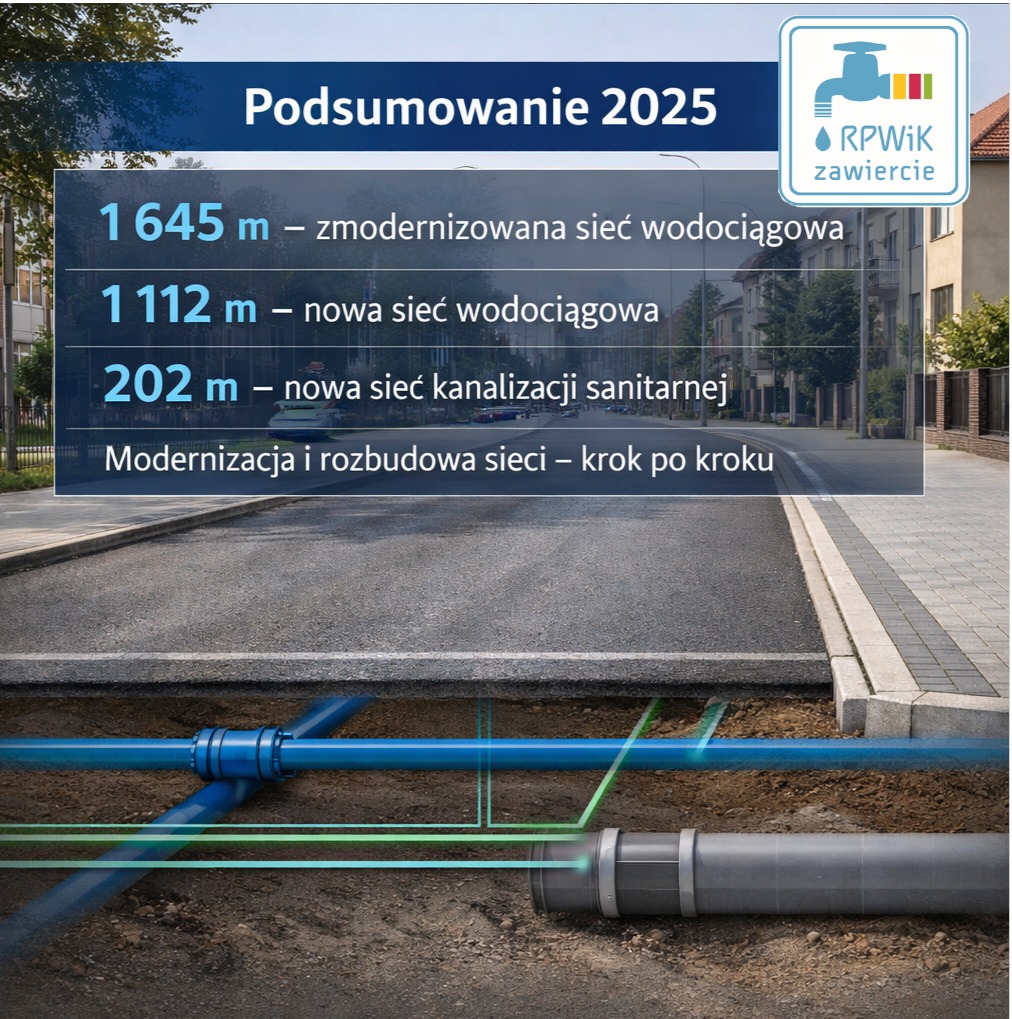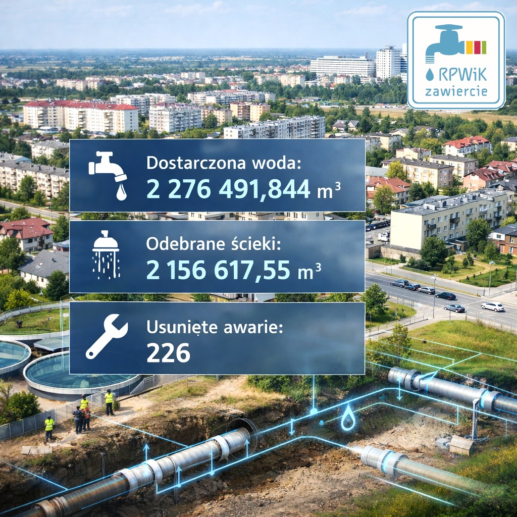 Podsumowanie roku 2025 pokazuje, jak duże jest obciążenie systemu wodno-kanalizacyjnego w Zawierciu. W tym okresie dostarczono ponad 2,27 mln metrów sześciennych wody, odebrano ponad 2,15 mln metrów sześciennych ścieków oraz usunięto 226 awarii na sieci. Za tymi liczbami stoją mieszkańcy, firmy, szkoły, placówki ochrony zdrowia oraz codzienne potrzeby miasta, które musi funkcjonować bez przerw.