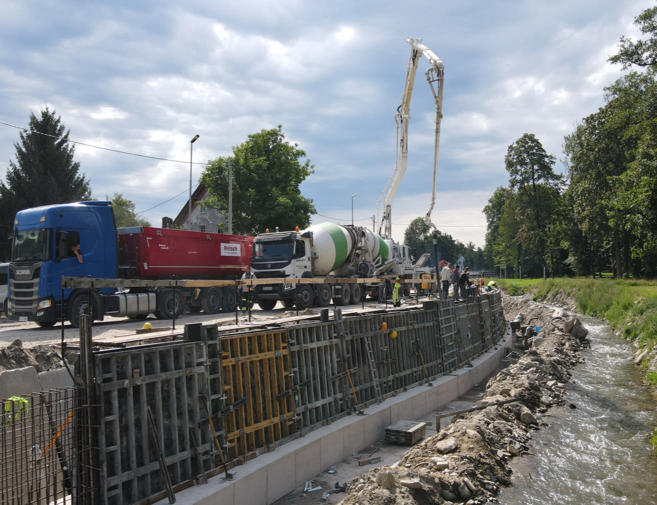 „Roboty prowadzone są odcinku od mostu tymczasowego w ciągu ul. Kościuszki do oczyszczalni ścieków przy ul. Wiejskiej. Wykonawca obecnie skupia się na odbudowie i reprofilacji murów oporowych, a także odtwarzaniu umocnień brzegowych i wykonaniu narzutu kamiennego”- informuje RZGW Wrocław.
